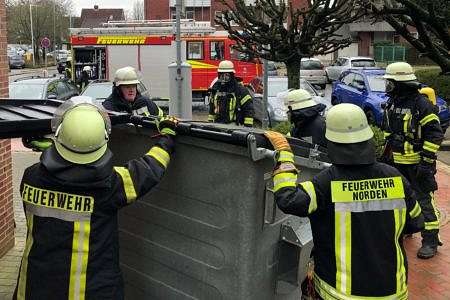 Hinter einem Kaufhaus in der Osterstraße in Norden hat am Dienstagvormittag ein Müllcontainer gebrannt. Passanten hatten gegen 10.40 Uhr zunächst Rauch auf dem Parkplatz bemerkt, dann einen Notruf abgesetzt und die Mitarbeiter des Kaufhauses informiert. Während die alarmierte Freiwillige Feuerwehr Norden anrückte, schleppten Verkäuferinnen mehrere Eimer Wasser herbei und begannen das Feuer erfolgreich zu löschen. Die Feuerwehrleute brauchten so nur noch Nachlöscharbeiten durchführen. Hierzu kippten sie den Stahlbehälter um und entleerten ihn. Neben der Feuerwehr war auch die Polizei vor Ort.
