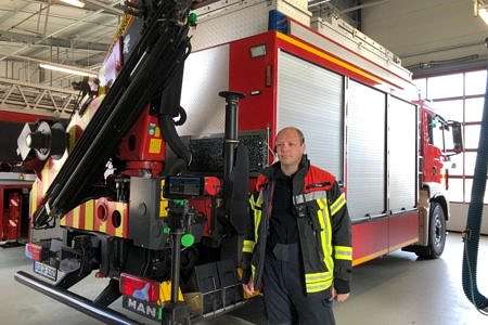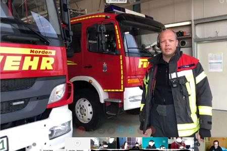 Nordens stellvertretender Stadtbrandmeister, Thomas Weege, führte dabei rundweg 30 virtuelle Gäste durch das Hilfeleistungszentrum. Als Kamera diente ein Smartphone auf einem Stativ und für eine deutliche Verständigung zwischen Ostfriesland und dem Main-Taunus-Kreis erwies sich ein Bluetooth-Headset als sehr dienlich. Tochter Tomke assistierte fleißig als Kamerafrau. Ingo Horn, Kinderfeuerwehrwart in Vockenhausen, moderierte und ergänzte vom PC aus mit Fotos und Videoclips zu den Ausführungen. Fast eine Stunde konnten so die Kinderfeuerwehrkinder mit ihren Eltern, Geschwistern und Betreuern über die Norder Wehr und ihre Besonderheiten informiert werden.