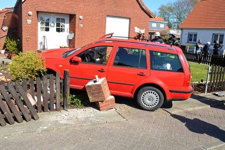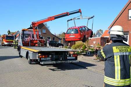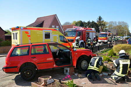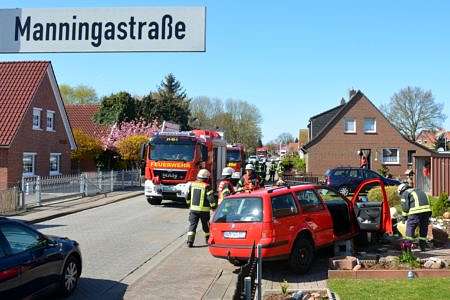 Auf der Kreuzung Manningastraße/Zuckerpolderstraße in Norden ist es am Sonnabendnachmittag zu einem Unfall gekommen. Zwei Pkw hatten sich dort touchiert. Ein Golf Variant war danach in einem Vorgarten zum Stehen gekommen. Nach dem Zusammenstoß überfuhr er noch zwei gemauerte Steinpoller. Neben Rettungsdienst und Polizei wurde auch die Freiwillige Feuerwehr Norden alarmiert. Als die Feuerwehr eintraf, hatte der Rettungsdienst die Frau jedoch bereits durch die Beifahrertür befreit. Die Dame kam ins Norder Krankenhaus.