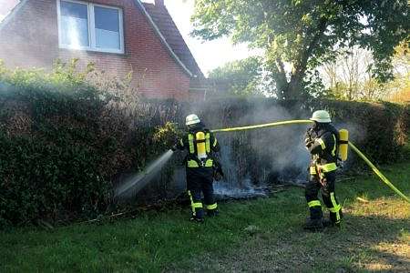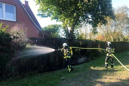 In Norddeich ist am späten Sonnabendnachmittag eine Hecke aus bislang unbekannten Gründen in Brand geraten. Anwohner des Nordbrooksweg hatten gegen 17.50 Uhr Rauch bemerkt und darauf die unmittelbar neben einem Wohnhaus brennende Thujahecke entdeckt. Die alarmierte Freiwillige Feuerwehr Norden löschte das Feuer und wässerte die übrige Hecke mit reichlich Wasser. Neben der Feuerwehr war ebenfalls die Polizei vor Ort.