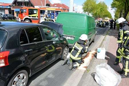 Drei Autos waren am Donnerstagnachmittag an einem Verkehrsunfall im Norder Ortsteil Bargebur beteiligt. Zwei Kleinwagen sowie ein Bulli waren gegen 15 Uhr auf der Heerstraße an der Einmündung zur Straße Am Schlicktief aufeinander aufgefahren. Insgesamt drei Insassen kamen teils leicht verletzt zur Kontrolle ins Krankenhaus, darunter auch eine schwangere Frau. Polizei, Rettungsdienst und Feuerwehr waren mit mehreren Fahrzeugen vor Ort. Während die Polizei die Unfallstelle absicherte, versorgten Feuerwehr und Rettungsdienst die Unfallbeteiligten. Weiterhin kümmerten sich die Feuerwehrleute um auslaufende Betriebsstoffe. Die Heerstraße wurde zunächst voll gesperrt. Später, ehe alle Fahrzeuge durch ein Abschleppunternehmen geborgen waren, konnte der Verkehr einseitig an der Unfallstelle vorbeifließen.