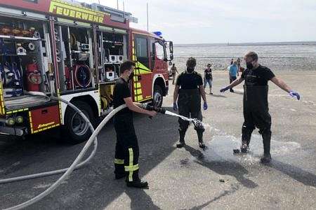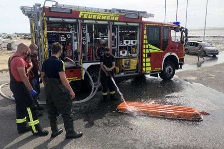 Neben dem Rettungsdienst wurde auch die Freiwillige Feuerwehr Norden nach Norddeich geschickt. Als die Einsatzkräfte am Strand eintrafen, wurden andere Spaziergänger im Watt auf die Situation aufmerksam und liefen der Mutter mit Kind entgegen. Während die Feuerwehrleute sich mit einer Trage auf ins Watt machten, trugen mehrere Männer ihnen den Jungen entgegen. Auf halber Strecke traf man sich und in der Trage ging es für den jungen Nordseegast weiter zur Uferpromenade. Nachdem die Feuerwehr ihn dort mit Wasser aus einem Löschschlauch grob gereinigt hatte, konnte der Rettungsdienst die Wunde in Augenschein nehmen. Nach einer Wundversorgung vor Ort konnte der Urlaub ohne Krankenhausbesuch fortgesetzt werden.