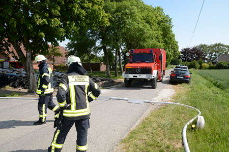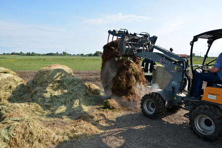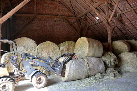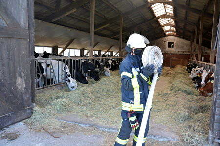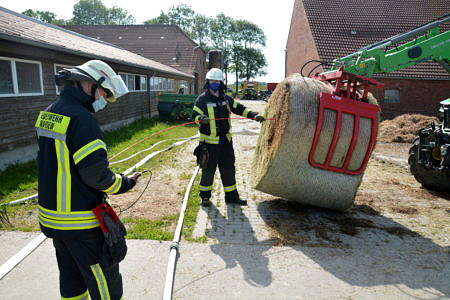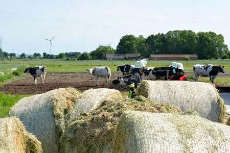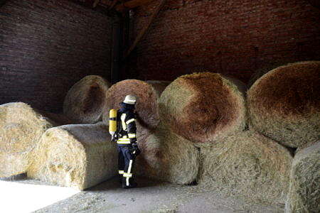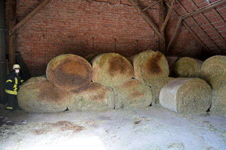 Mit einem Trecker mit Frontlader und einem kleinen Radlader wurde die Lagerstätte dann aufgelöst. Mehrere Ballen dampften dabei kräftig. Alle Ballen wurden außerhalb der Scheune gemessen. Ein Heuballen hatte im Inneren eine Temperatur von sogar über 100 Grad. Die Hälfte der Ballen wurde direkt auf einer Weide auseinandergerissen und einer Herde Jungkühe zum Verfüttern und Spielen vorgeworfen. So war die Brandgefahr gebannt. Die anderen Ballen wurden separiert und werden nun weiter vom Landwirt kontrolliert. Während sich die Kühe in den großen Mengen Heu erfreuten, zeigten sich die Landwirtfamilie und Familie darüber erleitchert, dass ein Großbrand verhindert wurde.