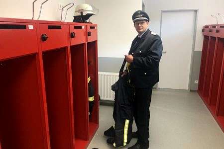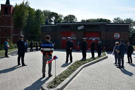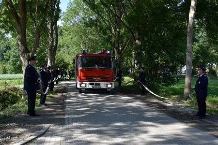 Als der Schriftzug auf der Außenwand über den beiden Hallentoren enthüllt wurde, konnte das Löschfahrzeug aus dem alten Feuerwehrhaus in das neue Gebäude umziehen. Ein Spalier aus Feuerwehrleuten und Schläuchen zierte den nur 100 Meter langen Weg. Anschließend konnte Zugführer Ralf Scharfenort mit seinen Einsatzkräften die Spinde in den Umkleideräumen beziehen. Für alle ein ehrwürdiger Moment.