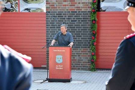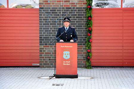 Bürgermeister Heiko Schmelzle hob in seiner Ansprache die besondere Bedeutung des Standortes Leybuchtpolder hervor. Während im Norder Stadtgebiet die Feuerwehr vom im Stadtosten befindlichen Hilfeleistungszentrum in alle Ortsteile ausrückt, ist der 4. Zug im Westen der Stadt für schnelle Eintreffzeiten in den Ortsteilen Leybuchtpolder, Neuwesteel und Teile von Westermarsch zuständig. Das alte Feuerwehrhaus ist inzwischen 60 Jahre alt und nicht mehr zeitgemäß. Außerdem wird das neue Hilfeleistungslöschfahrzeug, welches in wenigen Monaten ausgeliefert wird, nicht mehr in das alte Gebäude passen.