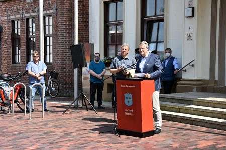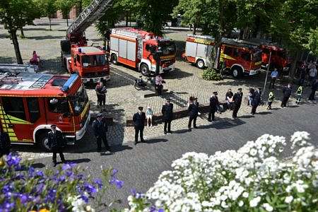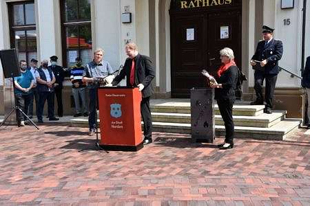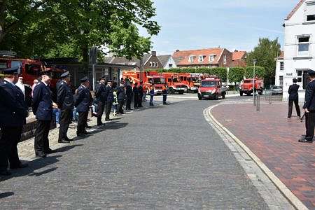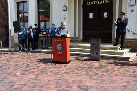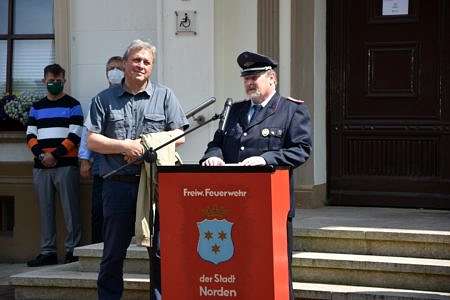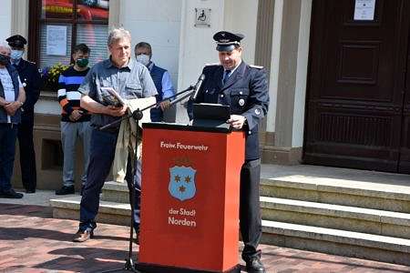 Am Freitagnachmittag, den 19.06.2020 füllte sich der Norder Marktplatz vor dem Rathaus mit dem Fuhrpark der Freiwilligen Feuerwehr Norden. Der Grund hierfür war einem besonderen Menschen eine verdiente Verabschiedung in den wohlverdienten Ruhestand zu ermöglichen. Die Rede ist von dem scheidenden Fachdienstleiter des Fachdienstes Bürgerdienste und Sicherheit, Uwe Fröbel.