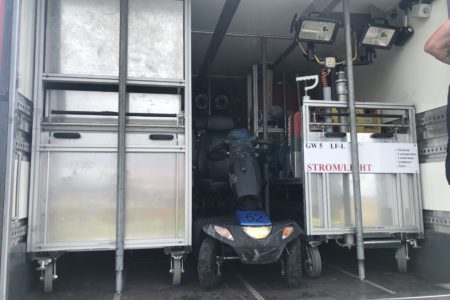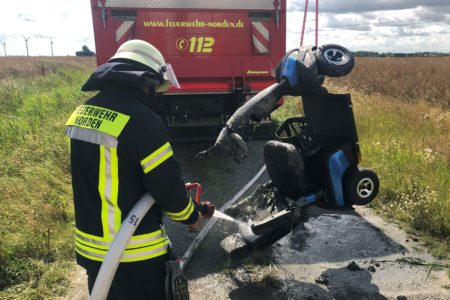 Eine Seniorin ist am Dienstagvormittag in Norden mit einem Elektromobil verunfallt und eine tiefe Grabenböschung hinuntergestürzt. Die Urlauberin war auf einer Spazierfahrt durch den Looger Weg unterwegs. Ihr Mann begleitete sie dabei auf einem Fahrrad. Das Pärchen verließ die befestigte Straße und wechselte auf einen Feldweg. Auf der unebenen Straße verlor die Frau die Kontrolle über ihr Mobil und stürzte rund eineinhalb Meter in einen wasserführenden Graben. Glücklicherweise blieb sie unverletzt und konnte sich alleine wieder aus dem Graben befreien, jedoch von Kopf bis Fuß mit Schlamm verschmutzt. Zur Bergung des Vehikels rückte die Freiwillige Feuerwehr Norden an. Mit einem Kran hoben sie es zurück auf den Feldweg. Anschließend wurde es mit Wasser aus einem Logistik-Fahrzeug grob gereinigt und mittels Ladebordwand aufgeladen. Auch die Frau konnte sich mit dem Löschwasservorrat den gröbsten Dreck abspülen. Eine Rettungswagenbesatzung hatte beide geschockten Urlauber vor Ort vorsichtshalber untersucht. Eine weitere Behandlung im Krankenhaus war jedoch nicht erforderlich.