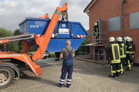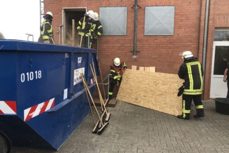 Die Feuerwehr entschied den Lagerraum vollständig zu entleeren. Da dies als kräfteraubende und zeitintensive Arbeit eingestuft wurde, die zudem nur unter umluftunabhängigen Atemschutz durchgeführt werden konnte, wurden weitere Feuerwehrkräfte nachalarmiert. Parallel lieferte ein Containerdienst mehrere Mulden zur Einsatzstelle, in die das Gemisch hineingeschaufelt werden sollte. Weiterhin wurde ein spezieller Saugwagen von einem Privatunternehmen angefordert. Atemschutzgeräteträger begannen mit der Entleerung und trugen in mühevoller Arbeit die oberste Schicht des Lagerguts ab. Insgesamt rund sechs Tonnen schaufelten und schoben sie aus dem Bunker. In dieser Schicht war die Wahrscheinlichkeit von Glutnestern am größten. Wären diese gleich mit einem Saugwagen abgesogen worden, hätte es in dem Fahrzeug zu einer heftigen Staubexplosion kommen können. Daher war zunächst Handarbeit gefordert. Die Tischler hatten den Feuerwehrleuten schnell aus Holzplatten eine Art Rutsche gebaut, um das Gemisch effektiver in den Container zu befördern.