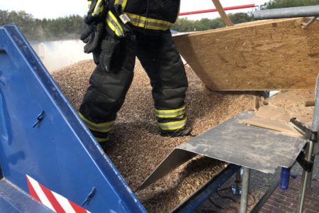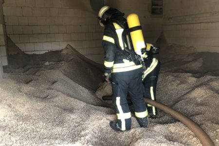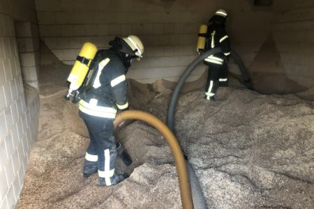 Später übernahm das Spezialfahrzeug den Großteil der Arbeit. Atemschutzgeräteträger mussten nur zwei Saugschläuche in das hölzerne Gemisch halten und es zusammenschieben. Das Fahrzeug entleerte sein aufgenommenes Gut in die bereitgestellten Container. Normalerweise mischt dieses Lkw Futter für Rinder. Derartige Feuerwehreinsätze hatte es bis dahin noch nicht geleistet. Nach über fünf Stunden war der Bunker endlich entleert. Mehr als 25 Tonnen Späne-Pellets-Gemisch waren dann ausgeräumt und die Brandgefahr im Gebäudeinneren gebannt.
