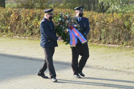 Das Lied „Ich hatt‘ einen Kameraden“ sorgt immer für Gänsehaut, besonders wenn es live aus einer Trompete erklingt. Zu Ehren ihrer verstorbenen Kameraden tritt die Norder Feuerwehr gewöhnlich am Volkstrauertag beim Hilfeleistungszentrum an. Im letzten Jahr wurde dort eigens für verstorbene Feuerwehrkameraden eine Gedenkstätte errichtet. Konnte man letztes Jahr noch mit einer Vielzahl an Kameradinnen und Kameraden daran teilnehmen, so war dies in diesem Jahr wegen der Pandemie nicht möglich. Dennoch traten Sonntagvormittag Stadtbrandmeister Thomas Kettler und sein Stellvertreter Thomas Weege zwar alleine, aber trotzdem in einem würdigen Rahmen an. Bernd Fuhrmann vom Stadtorchester spielte hierzu Trompete, während die beiden Führungskräfte einen Kranz niedergelegten.