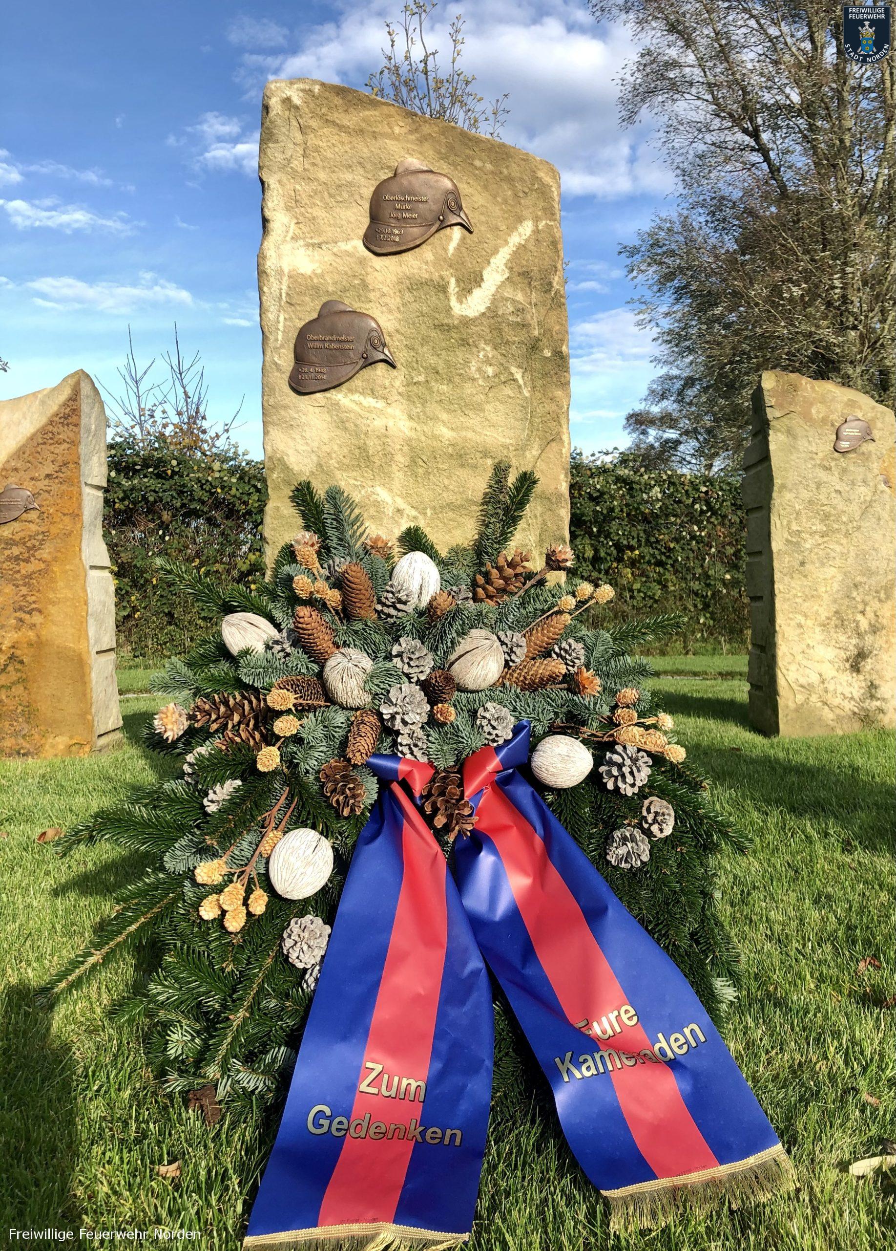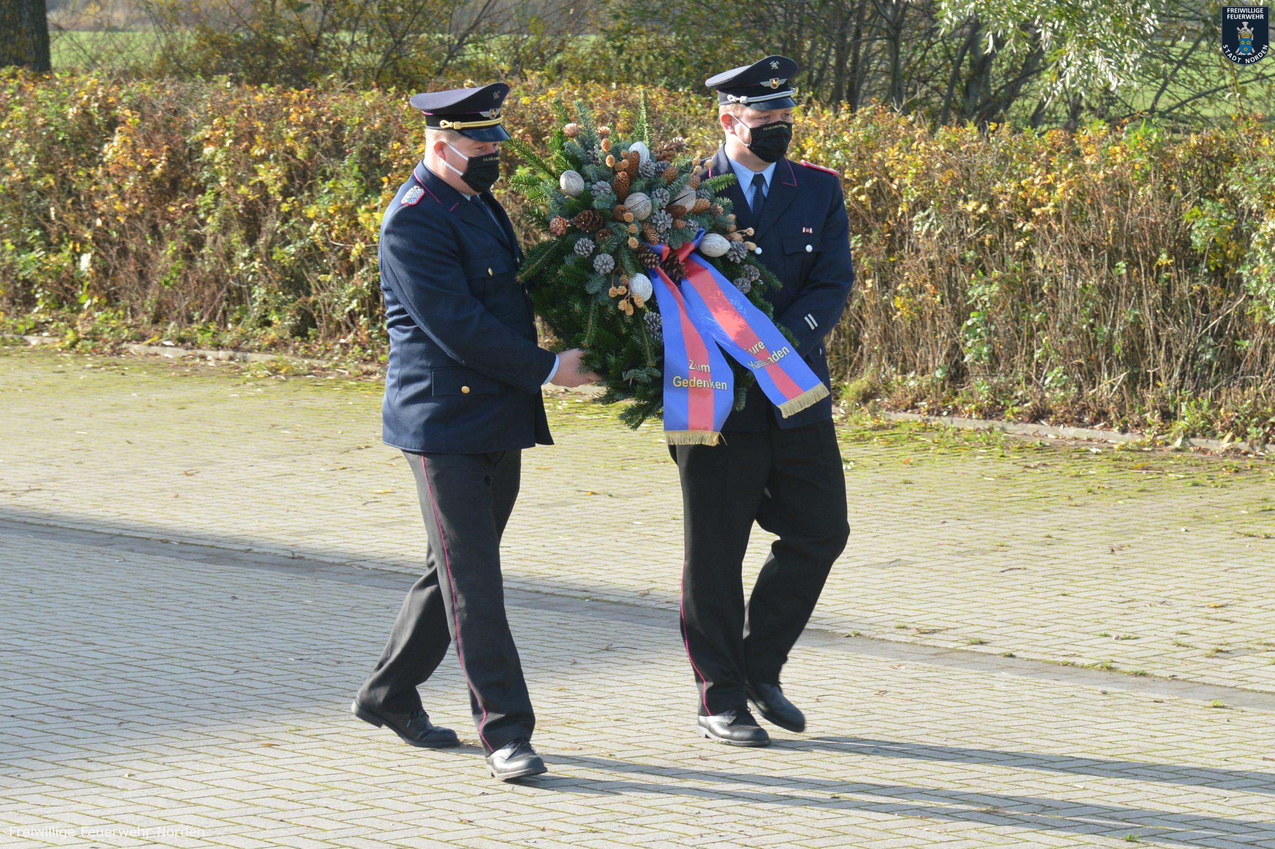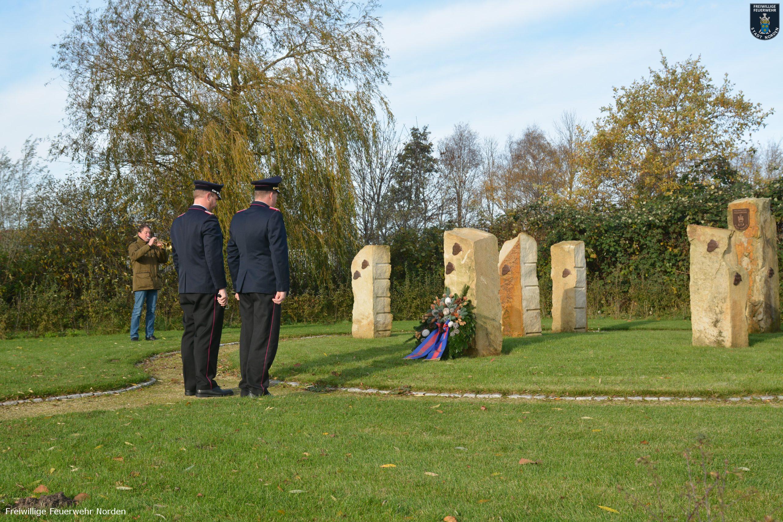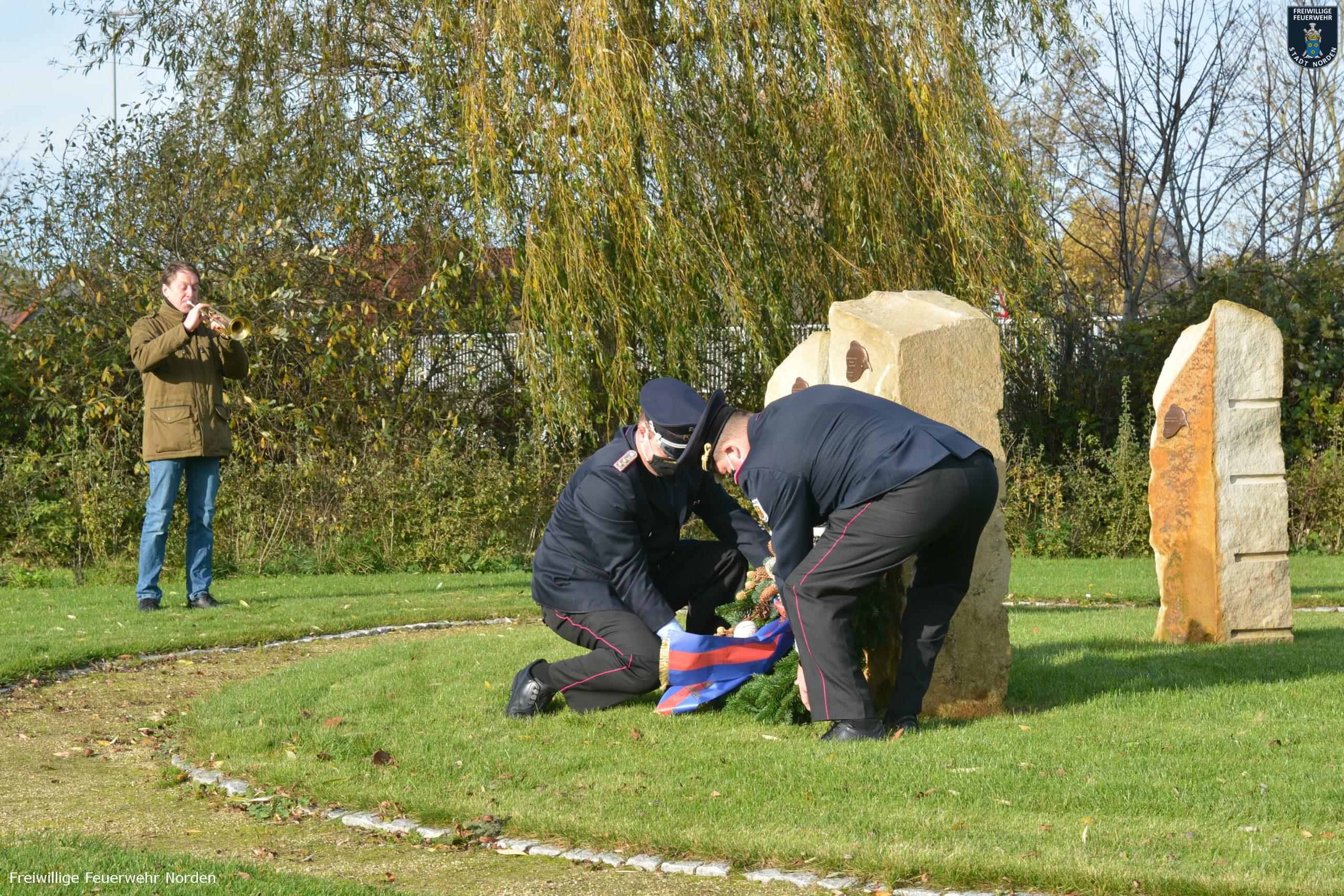 Das Lied „Ich hatt‘ einen Kameraden“ sorgt immer für Gänsehaut, besonders wenn es live aus einer Trompete erklingt. Zu Ehren ihrer verstorbenen Kameraden tritt die Norder Feuerwehr gewöhnlich am Volkstrauertag beim Hilfeleistungszentrum an. Im letzten Jahr wurde dort eigens für verstorbene Feuerwehrkameraden eine Gedenkstätte errichtet. Konnte man letztes Jahr noch mit einer Vielzahl an Kameradinnen und Kameraden daran teilnehmen, so war dies in diesem Jahr wegen der Pandemie nicht möglich. Dennoch traten Sonntagvormittag Stadtbrandmeister Thomas Kettler und sein Stellvertreter Thomas Weege zwar alleine, aber trotzdem in einem würdigen Rahmen an. Bernd Fuhrmann vom Stadtorchester spielte hierzu Trompete, während die beiden Führungskräfte einen Kranz niedergelegten.