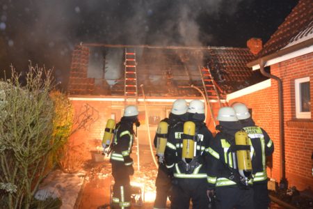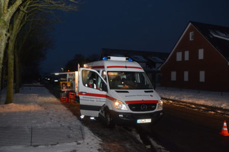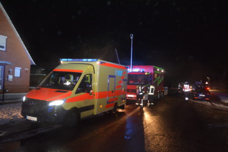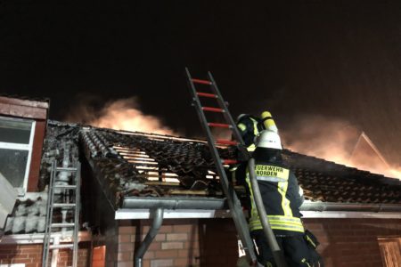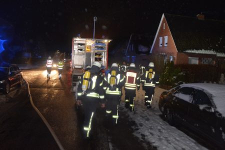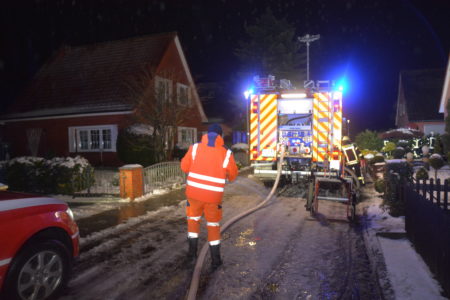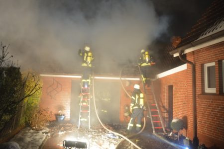 Mit widrigen Wetterbedingungen hatte die Freiwillige Feuerwehr Norden am Mittwochmorgen bei einem Garagenbrand zu kämpfen. Gegen 6 Uhr war ein Brand in der Bogenstraße gemeldet worden. Zuvor hatten Nachbarn ihn entdeckt, per Notruf gemeldet und die Hauseigentümer informiert. Bei Ankunft der Feuerwehr schlugen bereits Flammen aus dem Garagendach. Das Feuer wurde rasch größer und drohte auf ein Einfamilienhaus sowie zwei hölzerne Nebengebäude überzugreifen. Zudem erschwerte eine starke Rauchentwicklung die Sicht. Wegen nasskalter Witterung zog der Qualm bodennah durch die Wohnsiedlung. Das Bevölkerungswarnsystem KATWARN wurde daher ausgelöst und zum Schließen von Fenster und Türen aufgerufen. Die Feuerwehr griff den Brand von mehreren Seiten sowohl von außen als auch von innen an. So konnten alle Nachbargebäude gerettet werden. In einem der Nebengebäude befanden sich 25 Zuchttauben. Auch sie blieben von Feuer und Rauch verschont.