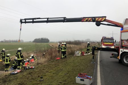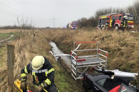 Auf der Norder Umgehungsstraße B72 ist es Freitagmittag kurz vor dem Ostermarscher Kreisverkehr zu einem Verkehrsunfall gekommen. Ein älterer Mann war gegen 13.25 Uhr mit seinem Mercedes eingangs einer langgezogenen Linkskurve nach rechts von der Fahrbahn abgekommen und in einem tiefen Straßengraben gelandet. Der Wagen war anschließend in dem Graben eingekeilt, wodurch sich die Türen des Fahrzeugs nicht öffnen ließen. Zwar schien der Fahrer augenscheinlich nicht schwer verletzt zu sein, jedoch konnten aufgrund des Unfallhergangs innere Verletzungen nicht ausgeschlossen werden. Folgerichtig entschied sich der Rettungsdienst eine schonende Rettung mit der Feuerwehr durchzuführen.