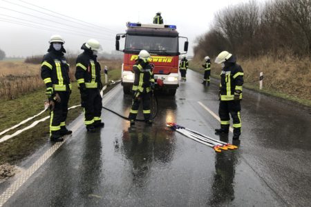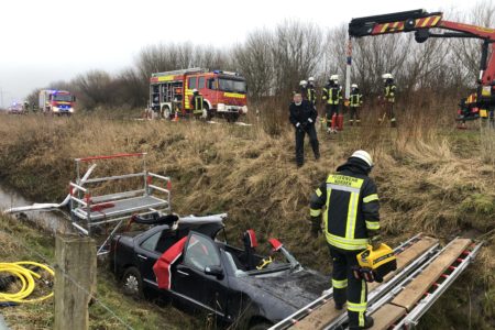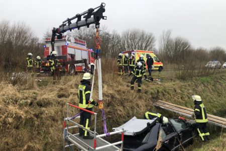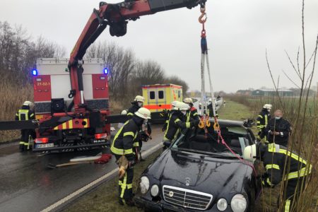 Einsatzkräfte der Freiwilligen Feuerwehr Norden bauten zunächst mit Leitern und einem Gerüst Brücken über den Graben. Danach wurde mit hydraulischem Rettungsgerät das Dach des Pkw entfernt. Das Unfallopfer konnte dann in eine Spezialtrage gelegt und mit einem Kran aus dem Wagen auf die Straße gehoben werden. Über die matschige Grabenkante war ein schonender Transport kaum möglich. Nachdem der Rentner sicher im Rettungswagen angekommen war, barg die Feuerwehr den verunfallten Wagen ebenfalls mit dem Kran aus dem Gewässer. Da der genaue Unfallort anfangs nicht genau klar war, wurden neben der Feuerwehr Norden, dem Rettungsdienst und der Polizei auch die Feuerwehren Hage und Lütetsburg alarmiert. Eine Streifenwagenbesatzung der Bundespolizei kam zufällig an der Unfallstelle vorbei. Die Beamten agierten bis zum Eintreffen der übrigen Rettungskräfte als Ersthelfer. Ein Abschlepper transportiere den Mercedes ab. Die Bundesstraße war bis 14.45 Uhr vollständig gesperrt.