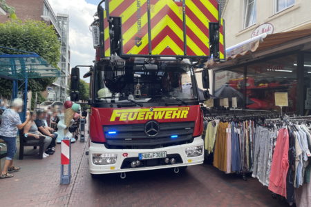 Nachdem das erste Löschfahrzeug den Einsatz an der Berufsschule beendet hatte, fuhr es ebenfalls zu dem zweiten Einsatz. Auch die am Hilfeleistungszentrum bereitstehende Drehleiter rückte nun aus. Da es sich bei dem Objekt um ein größeres Gebäude handelt, wurde es von zwei Seiten angefahren. Die Drehleiter und eines der Löschfahrzeuge konnten die Einsatzstelle jedoch nur mit erheblichen Verzögerungen erreichen. Sie blieben mittig in der Fußgängerzone stecken. Verkaufsstände, Markisen, abgestellte Fahrräder und jede Menge Menschen versperrten die Weiterfahrt. Nur zögerlich wurde den Einsatzkräften der Weg geräumt. Am Ende stellte sich heraus, dass es sich bei dem zweiten Einsatz ebenfalls um einen Fehlalarm handelte.