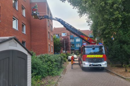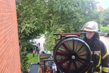Montagabend wurde die Freiwillige Feuerwehr Norden zu einem gemeldetem Wohngebäudebrand mit Menschenleben in Gefahr in die Strasse „Große Lohne“ gerufen. Aufgrund der Objektgröße und der damit zu erwarteten Verletzen bzw. zu betreuenden Personen wurde der Rettungsdienst sowie das Deutsch Rote Kreuz mit dem Stichwort MANV (Massenanfall von Verletzten) zeitgleich zur Einsatzstelle alarmiert. Die ersten eintreffenden Fahrzeuge konnte eine Rauchentwicklung aus einer Wohnung im 2 Obergeschoss bestätigen. Ein Trupp unter Atemschutz ging zu Erkundung in die verrauchte Wohnung vor. Im Bereich des Badezimmers konnte ein Brand von Papierunterlagen durch den Trupp gelöscht werden. Im Anschluss wurde das Objekt mit Hochleistungslüftern entraucht. Einer davon war auf dem Korb der bereits in Stellung gebrachten Drehleiter montiert und sorgte für die Belüftung durch ein Fenster im 2. Obergeschoss. Für die am 05.06.2021 übergeben neuen Drehleiter war es der erste Brandeinsatz zu dem sie ausgerückt ist. Nach rund einer Stunde konnte die Einsatzkräfte von Polizei, Rettungsdienst, DRK und Feuerwehr welche mit 7 Fahrzeugen und zirka 50 Einsatzkäften vor Ort war, den Einsatz beenden. Glücklicherweise ist niemand durch das Brandereignis verletzt worden.