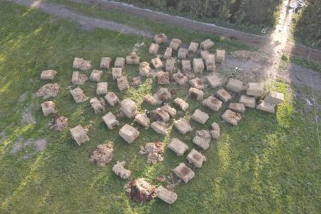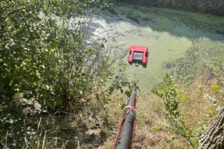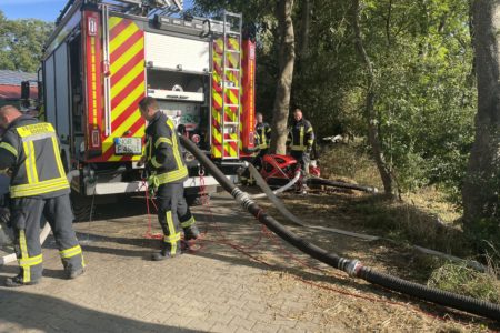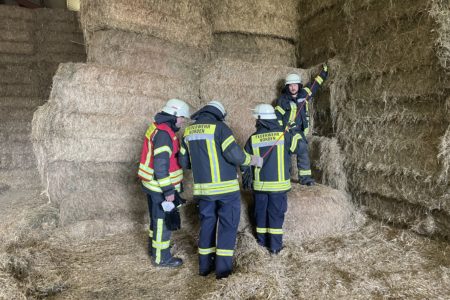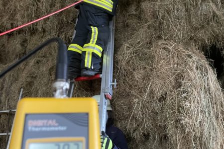 Schnell stand fest, dass die Temperaturen sich in einem kritischen Bereich befinden und das Lager auch bereits eingesunken war. Die Quaderballen mussten daher ausgefahren werden. Da akute Brandgefahr bestand, wurden weitere Einsatzkräfte nachalarmiert. Ehe das Heu jedoch ausgefahren werden konnte, bauten die Feuerwehrleute eine Löschwasserversorgung aus einem großen Graben sowie einen Löschangriff in der Scheune sowie auf einer Weide auf.