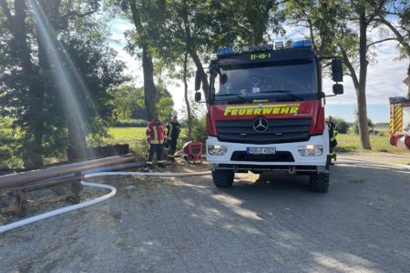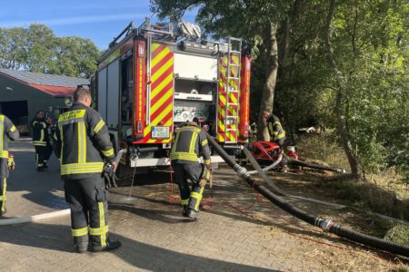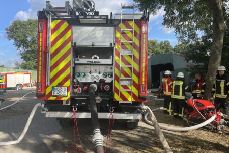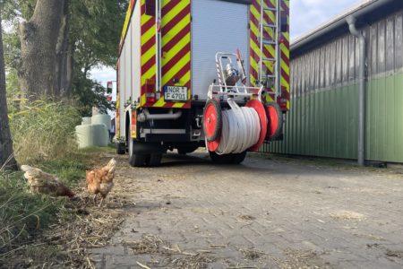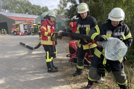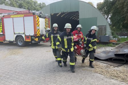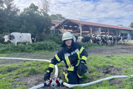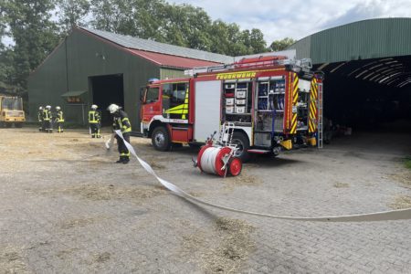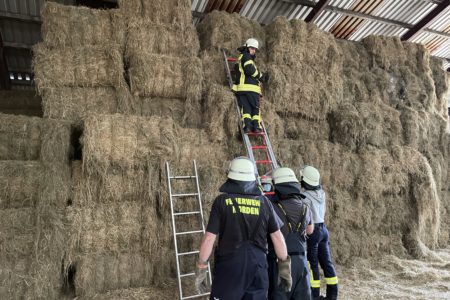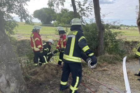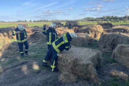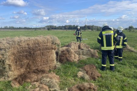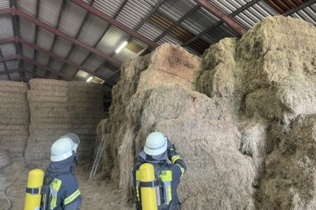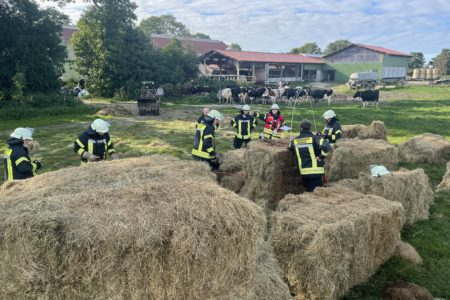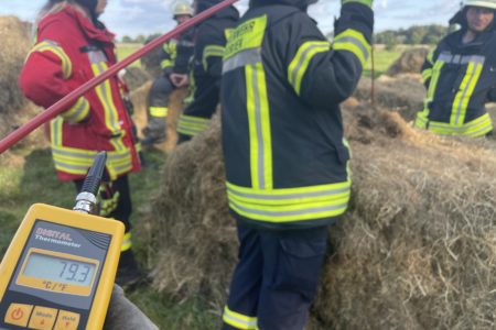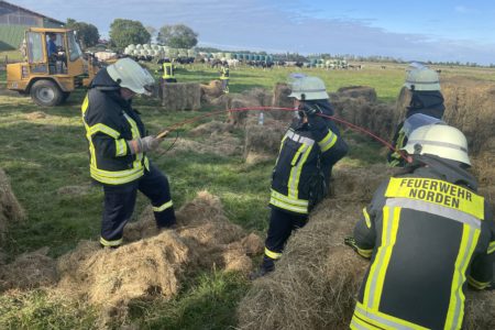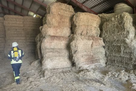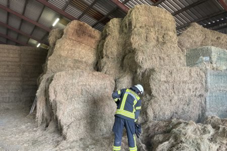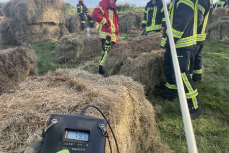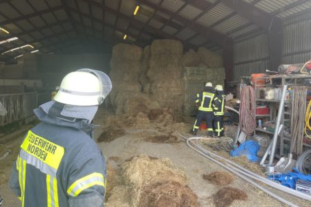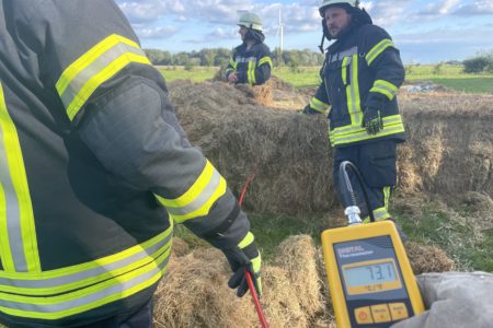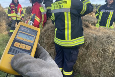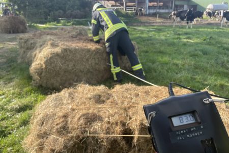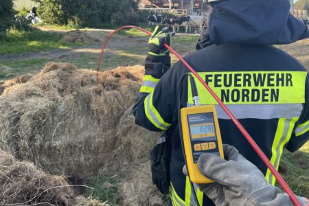 Den richtigen Riecher hatte ein Landwirt am Montag in Norden. Am Mittag bemerkte er typischen Geruch für eine sich anbahnende Heuselbstentzündung in einer seiner Scheunen. Sein Auszubildender und ein weiterer zufällig anwesender Landwirt, beide Mitglieder der Norder Feuerwehr, bestätigen den Geruch und fanden in der Lagerstätte auch gleich mehrere stark erwärmte Stellen. Sie forderten ihre Kameraden mit einem speziellen Heumessgerät an.