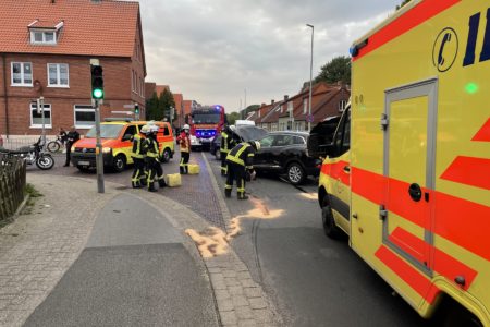 Zu einem Motorradunfall ist es am Sonntagabend in Norden auf dem Burggraben gekommen. Im Kreuzungsbereich Knyphausenstraße/Am alten Siel war ein Krad mit einem Pkw zusammengestoßen. Neben der Polizei und dem Rettungsdienst wurde auch die Freiwillige Feuerwehr Norden alarmiert. Während die beiden Pkw-Insassen mit dem Schrecken davonkamen, wurde der Motorradfahrer verletzt und kam in notärztlicher Begleitung mit einem Rettungswagen ins Krankenhaus. Die Feuerwehr sicherte die Unfallstelle ab, nahm ausgelaufene Betriebsstoffe auf und räumte die Kreuzung.