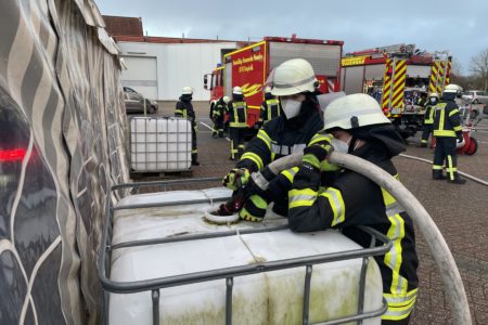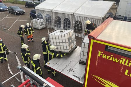 Ein Sturmtief namens Daniel überquerte am Mittwoch von der Nordsee kommend Ostfriesland mit Orkanböen. Die Freiwillige Feuerwehr Norden musste zu zwei Sturmeinsätzen ausrücken. Am Nachmittag hatte zunächst eine Sturmböe das Zelt eines Corona-Schnelltestcenters angehoben und die Bodenverankerung beschädigt. Damit der Testbetrieb weitergehen konnte, musste das Zelt gesichert werden. Die Freiwillige Feuerwehr Norden brachte vier Fasspaletten, auch als IBC bekannt, aus ihrem Lager zur Einsatzstelle auf dem Parkplatz des real-Marktes in der Straße Glückauf. Die Behälter wurden seitlich neben dem Zelt positioniert und jeweils mit mehreren hundert Litern Wasser gefüllt. Mit Spanngurten konnten die Einsatzkräfte das Zelt daran dann befestigen.