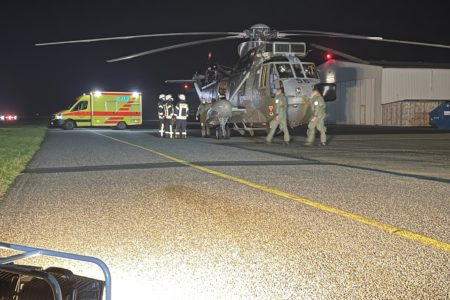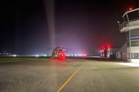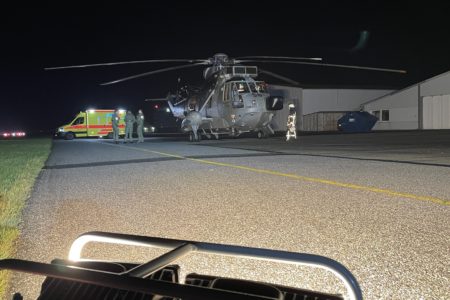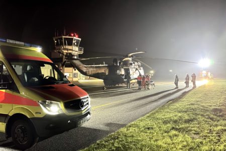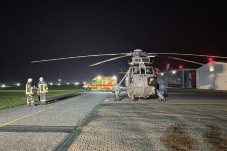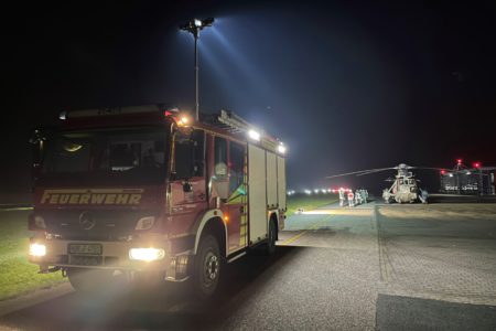 Um 19.15 Uhr wurde deshalb die Freiwillige Feuerwehr Norden zum Norddeicher Flugplatz alarmiert, um dort einen Landeplatz auszuleuchten. Neben der Ausleuchtung halfen die Feuerwehrleute den Patienten auf einer Trage aus dem großen Hubschrauber zu heben. Nach einer halben Stunde konnte der SAR-Hubschrauber wieder Richtung Borkum starten. Für die Feuerwehr war der Einsatz damit beendet.