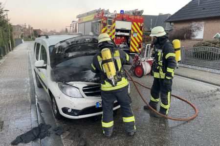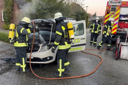 Ein Taxi ist am Dienstagmorgen in Norden im Schwanenpfad in Brand geraten. Der Taxifahrer wollte gegen 6.45 Uhr einen Fahrgast in der Straße abholen, als es plötzlich im Motorraum brannte. Schnell schlugen Flammen unter der Motorhaube empor. Während die Freiwillige Feuerwehr Norden sich auf den Weg zur Einsatzstelle machte, rollte ein Anwohner seinem Gartenschlauch aus und begann mit den Löscharbeiten. Bis zum Eintreffen der Einsatzkräfte konnte er so das Feuer unter Kontrolle bringen. Die Feuerwehr löschte letzte Flammen in dem ausgebrannten Motorraum.