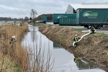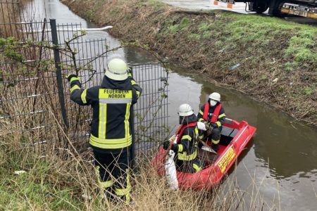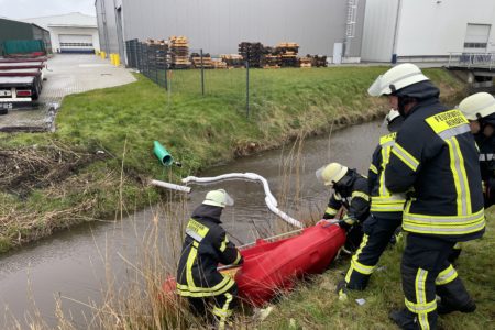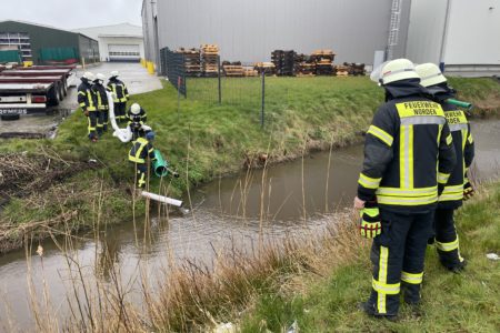 Auf einem Betriebsgelände im Gewerbegebiet Leegemoor ist am Mittwochvormittag Hydrauliköl ausgelaufen und in einen angrenzenden Kanal gelangt. Die Freiwillige Feuerwehr Norden rückte daraufhin zur Ölbekämpfung aus. Gegen 10.40 Uhr war an einem Gabelstapler auf dem Hof eines metallverarbeitenden Betriebes ein Schlauch geplatzt. Mehrere Liter Hydrauliköl traten dadurch aus. Obwohl Mitarbeiter des Betriebes versuchten mit Bindemittel eine Ausbreitung zu verhindern, spülte Regen das Öl in die Oberflächenentwässerung und von dort in den nördlichen Arm des Addinggaster Tiefs.