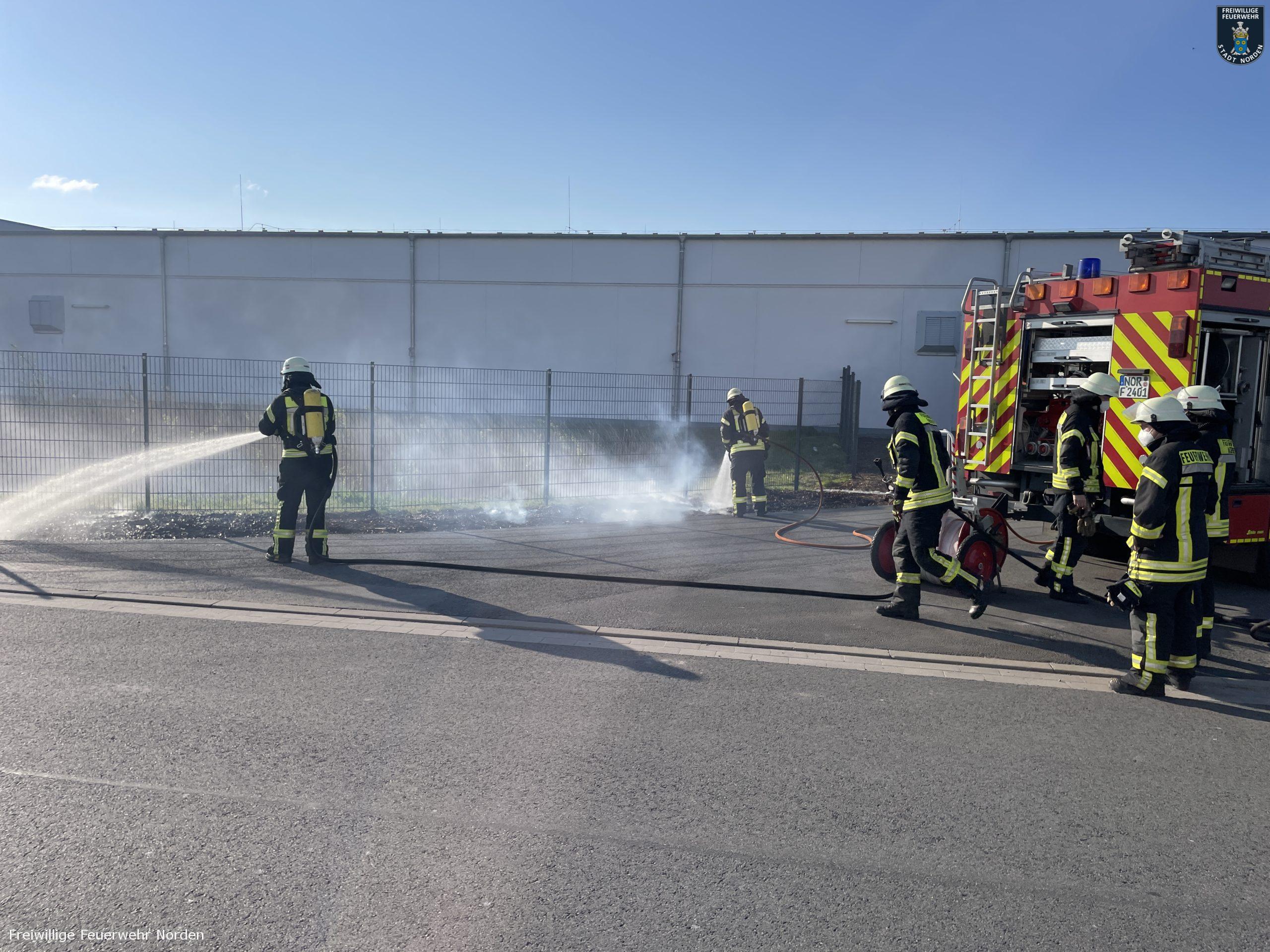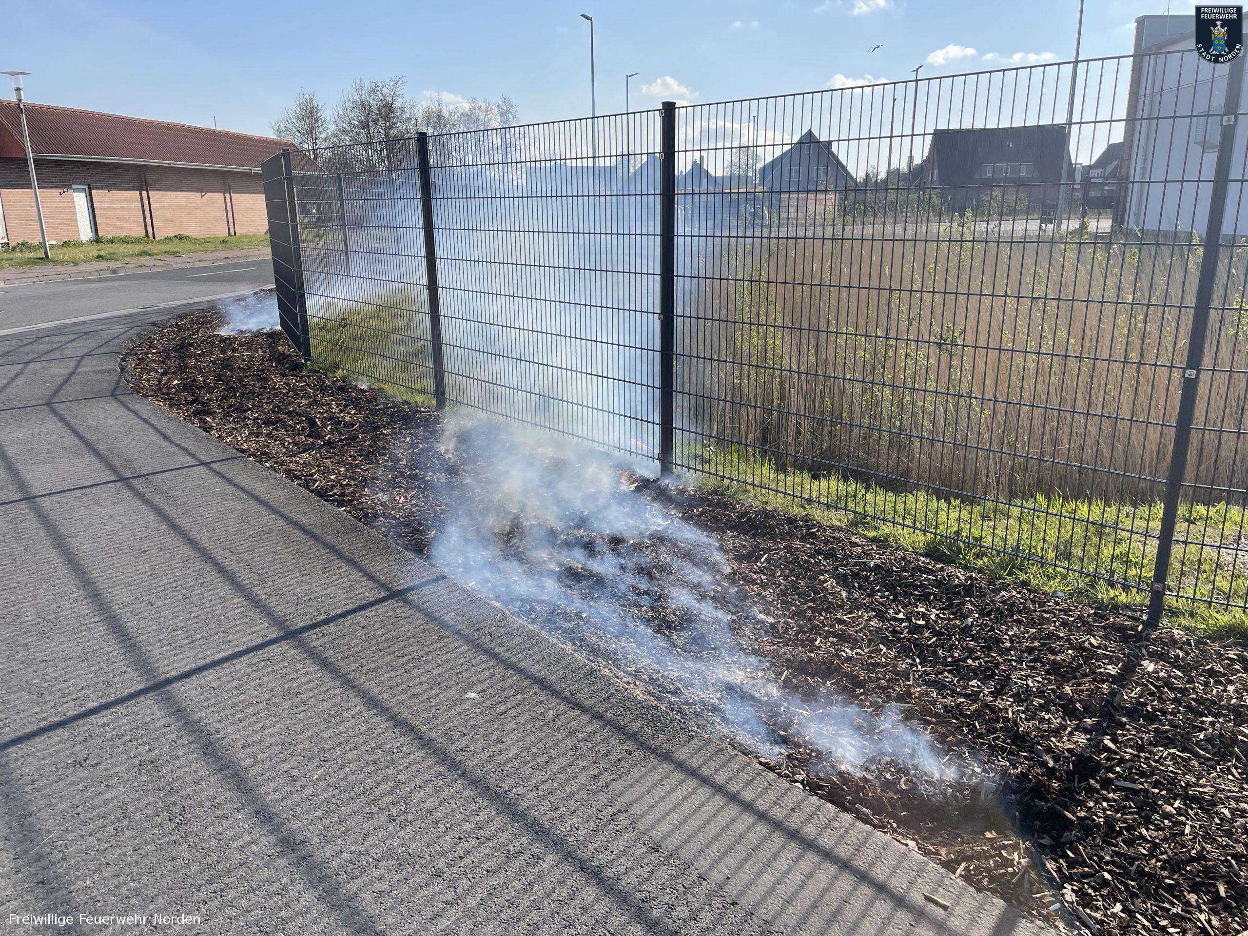 Auf dem Grundstück eines Discountmarktes in Norddeich hat es am Sonntagabend gebrannt. Gegen 18.00 Uhr hatte ein Radfahrer eine starke Rauchentwicklung neben einem Regenwasserrückhaltebecken an der Straße Zum Bahnkolk entdeckt und die Feuerwehr gerufen. Rindenmulch brannte dort in einem Beet. Die alarmierte Freiwillige Feuerwehr Norden löschte das Feuer mit zwei Strahlrohren.