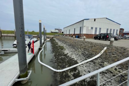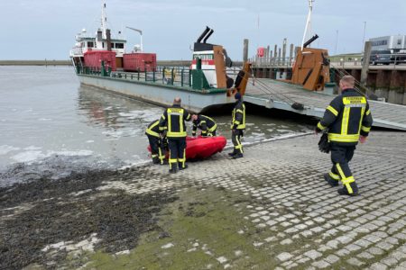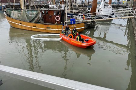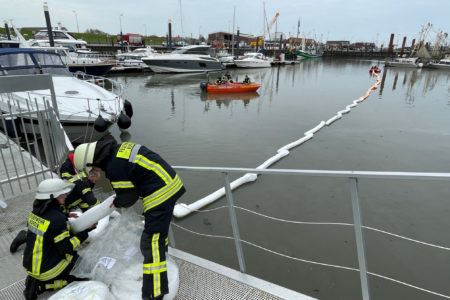 Am Donnerstagvormittag musste die Freiwillige Feuerwehr Norden mit einem Großaufgebot an Einsatzkräften und Material im Osthafen im Ortsteil Norddeich tätig werden. Die Wasserfläche dort war an mehreren Stellen vermutlich mit Schiffsdiesel auf einer Fläche von ca. 1000 m² verunreinigt. Mit den beiden Booten der Norder Wehr wurden ca. 200 Meter saugfähige aktive Ölsperren eingebracht und so die Verunreinigungen zusammengetrieben und gebunden. Die Ölsperren verbleiben einige Stunden in dem Gewässer und werden dann geborgen und fachgerecht entsorgt. Nach etwa vier Stunden konnte der Einsatz beendet werden. Neben der Freiwilligen Feuerwehr Norden mit sechs Fahrzeugen und etwa 25 Einsatzkräften waren auch die Wasserschutzpolizei, der Hafenbetreiber Niedersachsen Ports und der Niedersächsische Landesbetrieb für Wasserwirtschaft, Küsten- und Naturschutz im Einsatz.