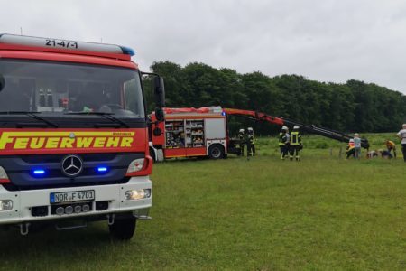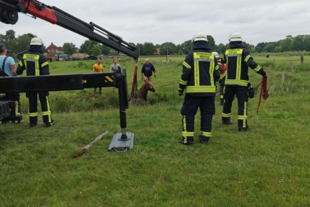 Am Freitagnachmittag wurde die Freiwillige Feuerwehr Norden zu einer Tierrettung in den Alten Postweg im Ortsteil Bargebur alarmiert. Vor Ort war eine Pferd in einen Graben geraten und konnte aus eigener Kraft nicht mehr herauskommen. Mit Hilfe des Kranes vom Rüstwagen und im Beisein eines Tierarztes konnte das Tier aus seiner misslichen Lage befreit und seinem Besitzer übergeben werden.