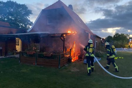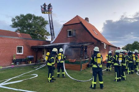 Eine Terrassenüberdachung und darunter befindliche Gartenmöbel sind am frühen Sonntagmorgen an einem Einfamilienhaus in Norddeich in Brand geraten. Anwohner der Molenstraße und Mitarbeiter einer nahegelegenen Bäckerei entdeckten gegen 5.50 Uhr im Morgengrauen die Flammen. Sie eilten zu dem Gebäude und weckten den Bewohner. Dieser hatte zeitgleich einen piependen Rauchmelder in seinem Haus wahrgenommen.