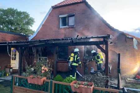 Der Mann konnte sich so rechtzeitig in Sicherheit bringen und bis zum Eintreffen der Freiwilligen Feuerwehr Norden mit einem Gartenschlauch erste wirkungsvolle Löschmaßnahmen einleiten. Das Feuer hatte unter anderem ein Küchenfenster beschädigt und sich dadurch ins Gebäudeinnere ausgebreitet. Die Feuerwehr bekam den Brand schnell unter Kontrolle und konnte eine weitere Ausbreitung verhindern. Es entstand erheblicher Sachschaden. Neben der Feuerwehr waren auch der Rettungsdienst, die Polizei sowie der Bereitschaftsdienst der Norder Stadtwerke im Einsatz.
