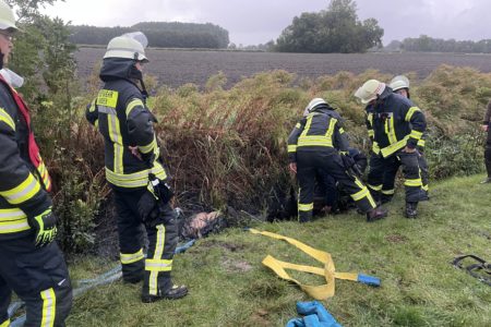 Für die Feuerwehr folgte erneut eine umfangreiche Reinigungsaktion von Mensch und Material. Dabei hatten sie erst wenige Stunden zuvor alles gereinigt. Unweit des Bauernhofs war es am Mittag zu einem schweren Verkehrsunfall gekommen. Auch dabei mussten die Feuerwehrleute in einem matschigen Graben arbeiten.