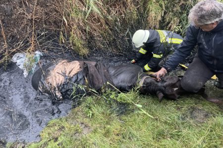 Feuerwehr, Besitzer und ein Tierarzt kämpften über eine Stunde um Stute „Wisteria“. Zwischenzeitlich hatte das Pferd schon die Mithilfe an seiner Rettung verweigert. Erschöpfung und Kälte waren dem Tier deutlich anzumerken. Sturmböen und Regenschauer erschwerten die Rettungsaktion ungemein. Mit Gurten, Tauen, einem Kran und ganz viel Muskelkraft gelang es den Helfern dann jedoch gemeinsam, Wisteria in einer wahren Schlammschlacht aus dem Graben auf ihre Weide zu ziehen. Nach einem kurzen Moment stand die Stute dann aus eigener Kraft sogar wieder auf. Ihre Besitzer brachten sie dann schnell in ihren warmen Stall, wo sie der Tierarzt untersuchte. Augenscheinlich hat das Pferd sein Malheur gut überstanden.