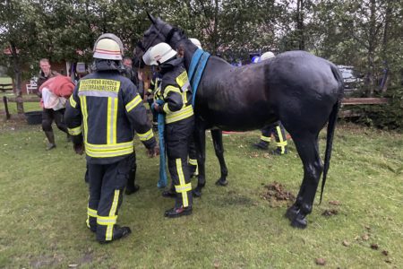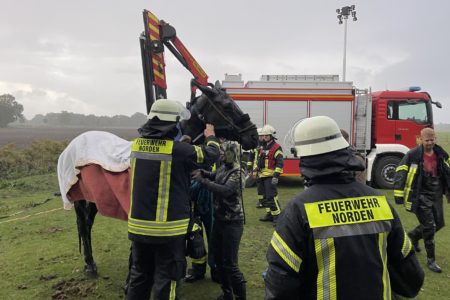Zu einer aufwändigen und dramatischen Rettungsaktion ist die Freiwillige Feuerwehr Norden am Freitag gegen 18.30 Uhr ausgerückt. Im Norder Ortsteil Westermarsch I war ein Pferd in einen Graben gestürzt und lag darin fest. Die Besitzer hatten zunächst selbst versucht, das Tier zu retten. Die 20-jährige Stute war jedoch zu tief im Schlamm eingesunken.