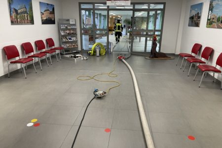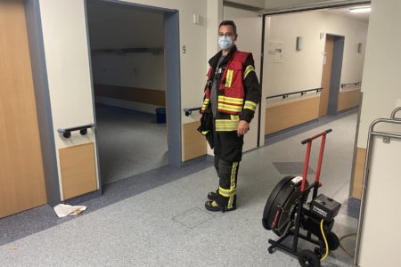 Glücklicherweise war dies nicht erforderlich. Atemschutzgeräteträger brachten den Zimmerbrand zügig unter Kontrolle. Mit mehreren Hochleistungslüftern befreite die Feuerwehr die betroffenen Bereiche von Rauch und Brandgeruch. Durch das umsichtige Handeln des Klinikpersonals und der Feuerwehr konnte eine weitere Ausbreitung von Feuer und Rauch sowie Personenschäden verhindert werden. Nachdem alle Räume ausreichend belüftet waren, konnten die Patienten nach Sichtung durch medizinisches Personal wieder unversehrt in ihre Zimmer zurückkehren. Lediglich ein kleiner Teil der direkt vom Brand betroffenen Station kann wegen Rauchniederschlägen vorerst nicht wieder genutzt werden. Bei der zwischenzeitlichen Betreuung der Betroffenen bekam das Krankenhauspersonal Unterstützung von Notfallseelsorgern der Kirche. Brandursache und Schadenshöhe sind noch unbekannt. Die Polizei hat die Ermittlungen aufgenommen.