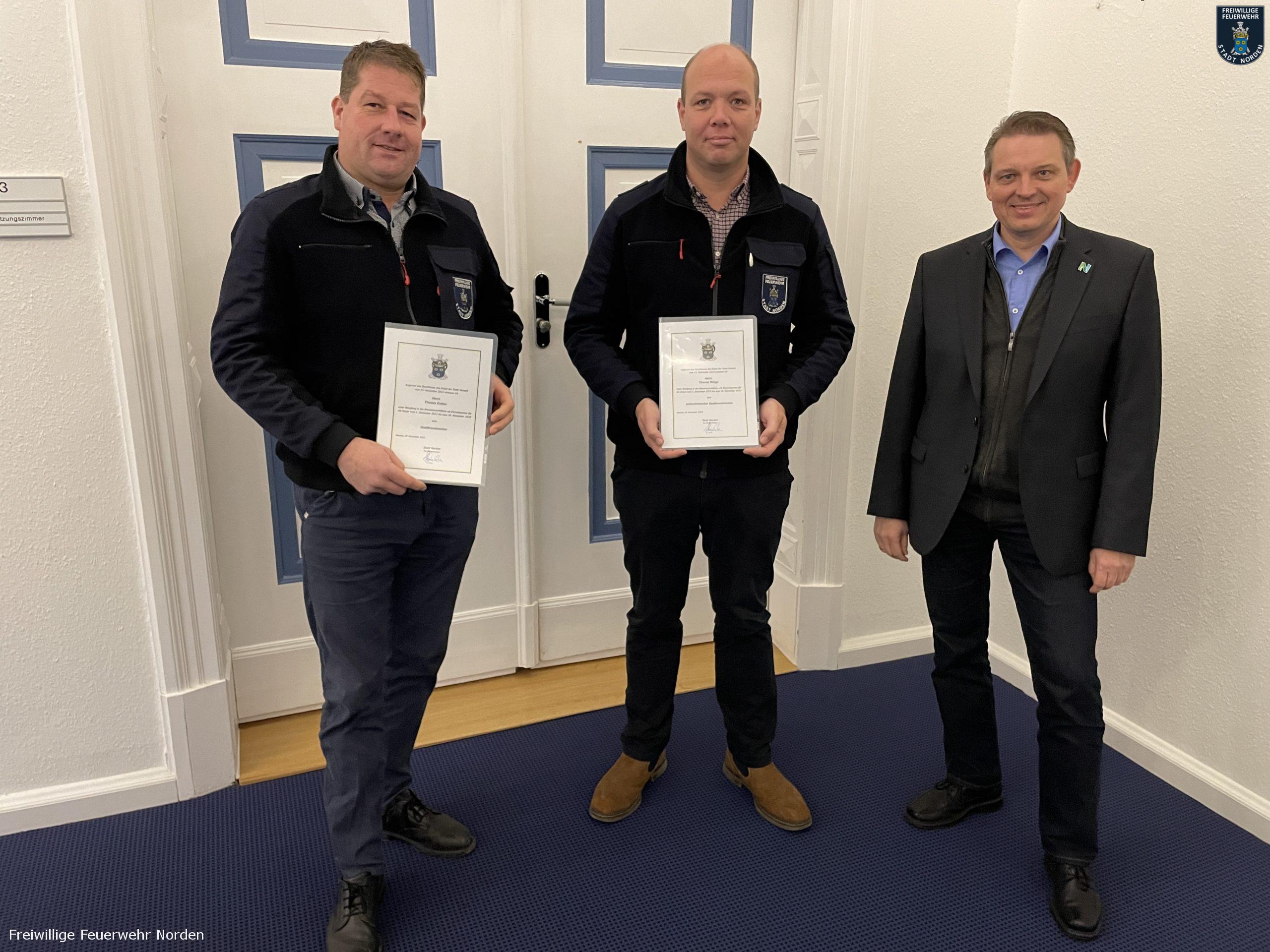 Die Amtszeit von Nordens Stadtbrandmeister Thomas Kettler und seinem Stellvertreter Thomas Weege ist am Montag offiziell um weitere sechs Jahre verlängert worden. Erster Stadtrat Marcus Aukskel vereidigte die beiden obersten Führungskräfte der Freiwilligen Feuerwehr Norden hierzu im Rathaus. Der Ernennung gingen eine Vorschlagswahl der aktiven Einsatzkräfte der Norder Wehr sowie ein Beschluss des Rates der Stadt Norden voraus. Um die Ämter rechtssicher ausführen zu können, ist nicht nur die erneute Ernennung zu Ehrenbeamten der Stadt Norden erfolgt, sondern auch die zu Vollzugsbeamten im Bereich der Brandbekämpfung und Hilfeleistung. Nachdem der Verwaltungsakt nun vollzogen ist, steht der neuen Amtszeit ab dem 01. Dezember 2022 nichts mehr im Wege. Kettler und Weege stehen bereits seit zehn Jahren – Kettler vier Jahre als stellvertretender Stadtbrandmeister und sechs Jahre als Stadtbrandmeister, Weege zehn Jahre als Stellvertreter – an der Spitze der Feuerwehr Norden.