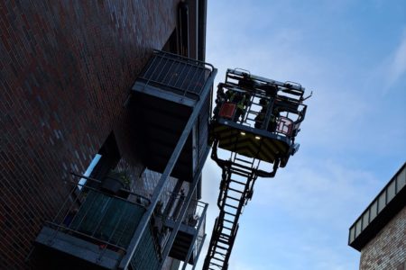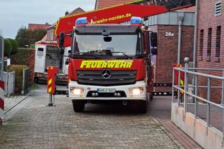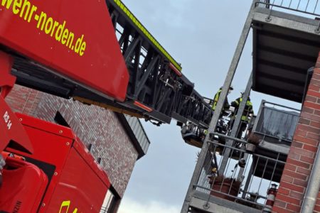 Am Montagnachmittag wurde die Drehleiter der Freiwilligen Feuerwehr Norden zur Unterstützung der Freiwilligen Feuerwehr Hage und des Rettungsdienstes beim Transport eines Notfallpatienten alarmiert. In einem Mehrfamilienhaus in der Hauptstraße in Hage musste ein Patient in einer Schleifkorbtrage über den Korb der Drehleiter schonend nach unten in den bereitgestellten Rettungswagen transportiert werden.