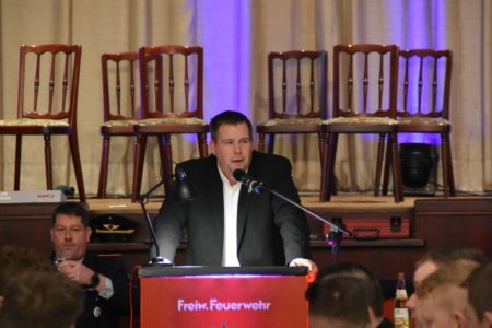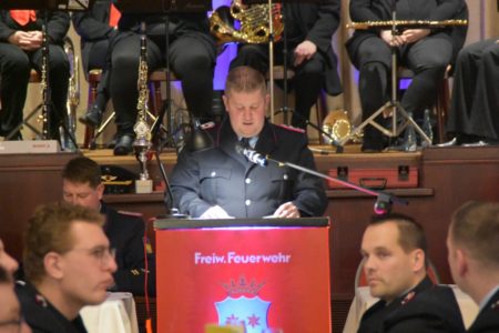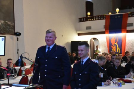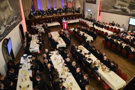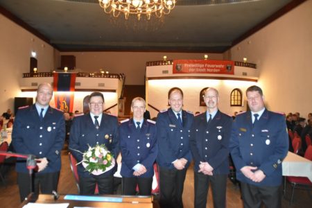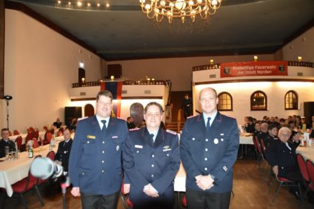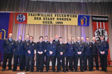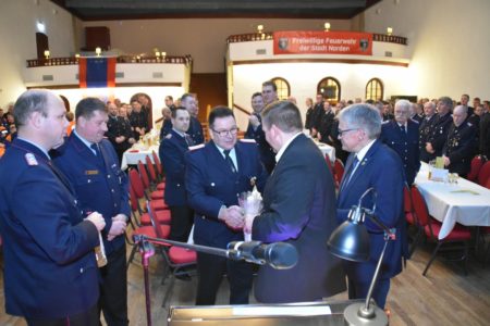 Unter dem Tagesordnungspunkt Ansprachen der Gäste meldeten sich Bürgermeister Florian Eiben, Landrat Olaf Meinen, der stellvertretende Abschnittsbrandmeister Dietmar Helmers und der Leiter des Polizeikommissariates Norden Ingo Brickwedde zu Wort. Bei allen Gästen kam in deren Ansprachen u. a. das Thema Gewalt gegen Einsatzkräfte aufgrund der Ereignisse in der Sylvesternacht in Berlin zur Sprache. Olaf Meinen konnte aus persönlichen Erfahrungen in Berlin berichten. Ingo Brickwedde konnte aus dem Zuständigkeitsbereich des Polizeikommissariates Norden bislang von keinen Übergriffen auf Einsatzkräfte berichten jedoch seien die Respektlosigkeiten gegenüber Polizeibeamten zunehmend. Alle Redner waren sich mit Stadtbrandmeister Thomas Kettler einig dass das Strafmaß bei solchen Taten nicht hoch genug sein kann. Florian Eiben sprach u. a. noch das Thema Wohnungsbau an. Dies Thema hätte höchste Priorität in Verwaltung und Politik, gerade im Bezug auf die Nachwuchsgewinnung in der Feuerwehr. Die Jugendarbeit im Bereich der Norder Wehr gehe genau in die richtige Richtung, das zeige sich gerade darin dass ein großer Teil der heutigen Einsatzabteilung aus der Jugendfeuerwehr hervorging. Stadtbrandmeister Kettler konnte dies noch mit eine Zahl von etwa 80 % verdeutlichen. Dietmar Helmers überbrachte die Grüße des Kreisfeuerwehrverbandes Aurich. Er freue sich diesmal bei der Veranstaltung dabei zu sein und auch jedes Mal bei Einsätzen nach Norden zu kommen, hier könne man immer etwas an Einsatzerfahrung mitnehmen.