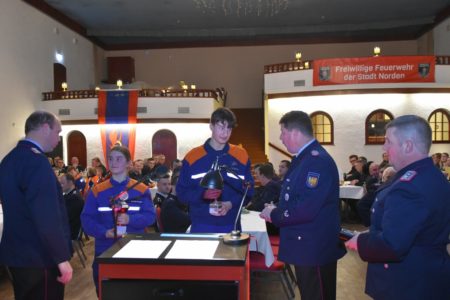 Stadtjugendfeuerwehrwart Daniel Blankenhagen konnte für die beiden Nachwuchsabteilungen der Norder Wehr in seinem umfangreichen Jahresbericht über ein Jahr berichten, in dem man das Schneckenhaus nach dem Endstadium der Pandemie wieder vorsichtig verlassen und zum Ende des Jahres fast wieder von Normalität sprechen konnte. Viele Aktivitäten und Aktionen konnten im Berichtsjahr wieder stattfinden. Für die Jugendfeuerwehr wären hier beispielsweise zu nennen die Auszeichnung von vier Mitglieder mit der Leistungsspange, der „Königsdisziplin“ der Deutschen Jugendfeuerwehr und die Teilnahme am Bundeswettbewerb auf Kreisebene in Wiesmoor mit einem hervorragenden 3. Platz und damit die Qualifikation für den Wettbewerb auf Bezirksebene in Lingen mit einem 19. Platz. Auch am Kreisjugendfeuerwehrtag in Ihlow nahm die Jugendfeuerwehr teil. Statt eines Zeltlagers besuchten die Jugendlichen mit ihren Betreuern den Freizeitpark Schloss Dankern an einem Wochenende. Bei der Kinderfeuerwehr waren die Unterstützung beim Maibaum auf dem Norder Marktplatz, der Besuch der Kooperativen Regionalleitstelle in Wittmund und die Brandflohabnahme von acht Kindern in der Krummhörn nur einige Höhepunkte. Daniel Blankenhagen gab noch einen kurzen Ausblick auf das Jahr 2023 mit der Ausrichtung des Bundeswettbewerbes auf Landkreisebene in Norden, Planung des beliebten Flohmarktes und Teilnahme am Kreiszeltlager.