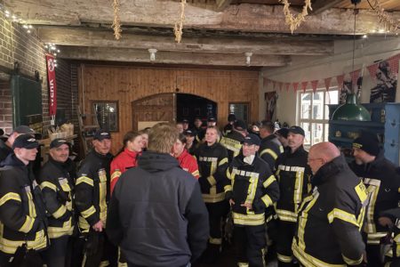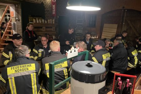Eine in der Tät schöne Überraschung hat die Mitglieder der Freiwilligen Feuerwehr Norden bei ihrem ersten Übungsabend am vergangenen Dienstag erwartet. Ursprünglich stand theoretischer Unterricht auf dem Dienstplan. Doch kurz Dienstbeginn verkündete Stadtbrandmeister Thomas Kettler eine kurzfristige Planänderung und ließ die über 80 anwesenden Einsatzkräfte auf dem Hof des Hilfeleistungszentrum antreten. Ohne weitere Informationen wurden alle Fahrzeuge zur Westgaster Mühle in die Alleestraße geschickt. Auf dem Weg kursierten die unterschiedlichsten Vermuteten, was dort wohl ansteht. Eine Einsatzübung? Vielleicht eine Übergabe von neuen Einsatzgerätschaften? Die Frauen und Männer der Einsatzabteilung waren sichtlich gespannt.