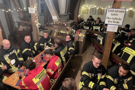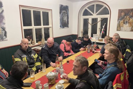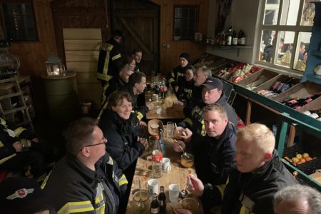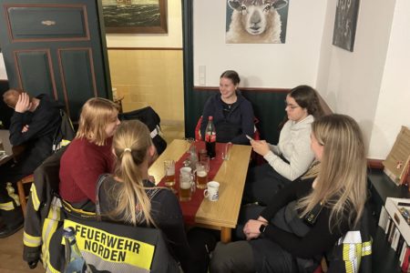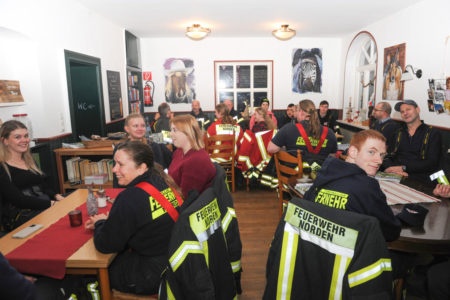 Vor Ort erwarteten sie Melanie Bartels und Heiko Wolff. Die beiden betreiben in der Mühle im Nebenerwerb eine Teestube mit Biergarten und Hofladen. Das Paar hat die Norder Feuerwehr an diesem Abend zum Essen eingeladen. In der Teestube und in der historischen Mühle bekamen die Einsatzkräfte Chili con Carne serviert. Heiko Wolff übernahm mit seinem Gartenbaubetrieb die Getränke. Mit ihrer Einladung drückten die Beiden den Ehrenamtlichen ohne einen konkreten Anlass ihren Dank aus. Sie verfolgen in den Medien aufmerksam die hohe Anzahl an Einsätzen und anderen Aktivitäten der Norder Feuerwehr. Das Engagement hat sichtlich Eindruck hinterlassen. Mindestens genauso beeindruckt waren die Feuerwehrleute von dieser Wertschätzung. Nach rund zwei Stunden klang der gemütliche Abend nicht nur körperlich, sondern auch in der Motivation gestärkt, aus.