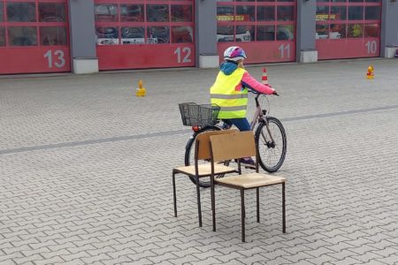 Dann sollte noch eine kleine Wasserflasche mit einer Hand von einem Stuhl auf einen anderen Stuhl abgestellt werden. Weiter ging es zum Polizeiauto, wo mit dem nötigen 1,5 Meter Abstand vorbei gefahren werden sollte. Die letzten Meter am Ziel wurde dann für eine Bremsung genutzt.