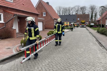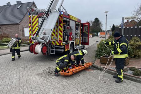 Die Freiwillige Feuerwehr Norden musste am Sonnabend eine kreative Lösung finden, um einen Patienten schonend aus seiner Dachgeschosswohnung zum Rettungswagen zu transportieren. Rettungsdienst und Notarzt behandelten den Mann am Nachmittag in der Möwenstraße. Der Weg durch das Treppenhaus schied aus Platzgründen aus. Auch die Dachfenster waren zu klein, um den Mann dadurch auf den Korb der Drehleiter zu hieven.