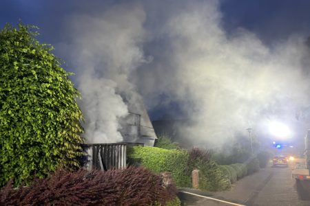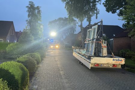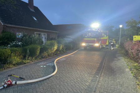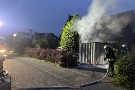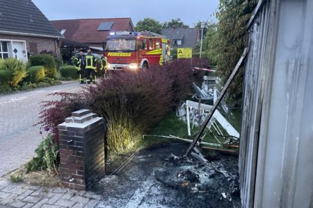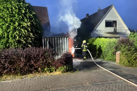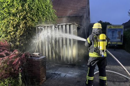 Als die Einsatzkräfte der Freiwilligen Feuerwehr Norden eintrafen, war in einem Vorgarten ein Mobil-WC bereits vollständig verbrannt. Etwas eher eingetroffene Polizisten hatten bereits einen Feuerlöscher gegen den Brand eingesetzt. Ein danebenstehender Materialcontainer brannte jedoch noch deutlich sichtbar im Inneren. Um das Feuer zu bekämpfen, mussten die Einsatzkräfte zunächst einen großen Anhänger mit Fensterelementen von der Grundstückseinfahrt auf die Straße schieben. Unter Atemschutz konnten die Feuerwehrleute das Feuer zügig löschen. In dem Container verbrannten diverse Werkzeuge und Baumaterialien.