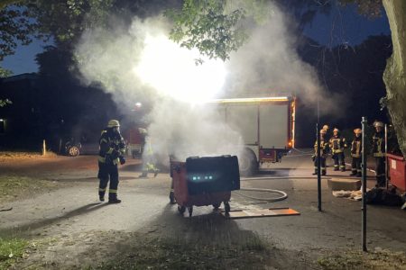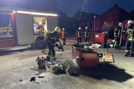Gleich zwei Brände musste die Freiwillige Feuerwehr Norden in der Nacht zu Dienstag parallel löschen. Gegen 3.40 Uhr wurden zunächst brennende Mülltonnen in der Koppelstraße gemeldet. Bei Ankunft der Feuerwehr brannten tatsächlich mehrere Mülltonnen, jedoch direkt an einem Mehrparteienhaus. Außerdem hatten die Flammen bereits auf eine Überdachung übergegriffen, unter der die Mülltonnen standen. Die Polizei hatte zuvor vergebens zwei Handfeuerlöscher eingesetzt. Noch während der laufenden Löscharbeiten entdeckten Polizisten nur hundert Meter weiter im Warfenweg einen brennenden Müllcontainer. Da die Feuerwehr bereits mit zwei Löschfahrzeugen in die Koppelstraße ausgerückt war, konnte eines der Fahrzeuge die zweite Einsatzstelle übernehmen.