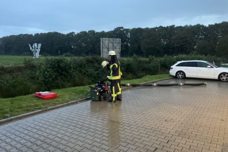 Weitere Einsatzkräften stellten am Dienstag auf unterschiedliche Weise die Wasserversorgung her. Ein Feuerlöschbrunnen auf dem Areal des Schulzentrums Wildbahn wurde genauso in Betrieb genommen, wie Hydranten und eine Wasserentnahmestelle aus einem Graben mit wenig Tiefe. Mit dem geländegängigen Schlauchwagen verlegten die Kräfte eine mehrere hundert Meter lange Schlauchleitung über eine Wiese. Das geförderte Löschwasser wurde über mehrere Wasserwerfer abgegeben. Obwohl den über 70 Feuerwehrleuten der mehrstündige Einsatz in der vorangegangenen Nacht merklich in den Knochen steckte und sie obendrein auch noch einen kräftigen Regenschauer abbekamen, arbeiteten sie die Übung motiviert und professionell ab.