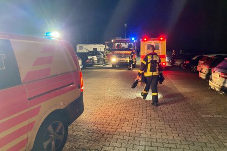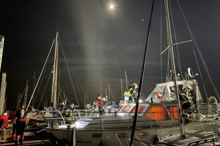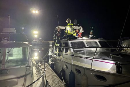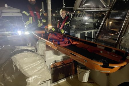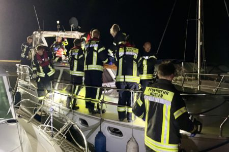 Ehe es jedoch an den Abtransport ging, musste ein Notarzt dem Patienten zunächst die Schmerzen medikamentös lindern und ihn in eine Vakuummatratze lagern. Zwischenzeitlich demontierten die Feuerwehrleute einige schwere Glasscheiben und brachten Teile der Bootsausrüstung von Bord. Ohne dem, hätte man den Patienten gar nicht aus dem Bootsinneren herausbekommen. Nachdem der Verletzte in der Vakuummatratzte geschützt einen schmalen Aufgang hochgezogen werden konnte, wurde er an Deck in eine Schleifkorbtrage gelegt. Darin hievte die Feuerwehr ihn dann über den Steuerstand auf das Vordeck und über den Bug von Bord auf die Steganlage des Yachthafens. Um für ausreichend Beleuchtung des dunklen Einsatzortes zu Sorgen, brachte die Feuerwehr auch ihre Drehleiter mit mehreren Scheinwerfern in Stellung.