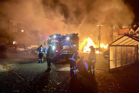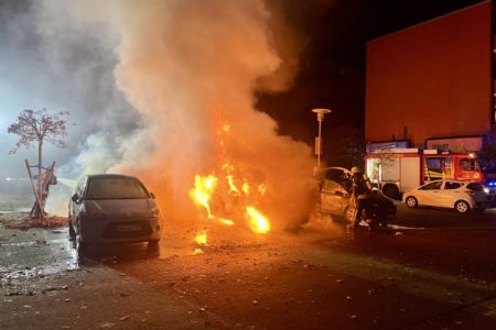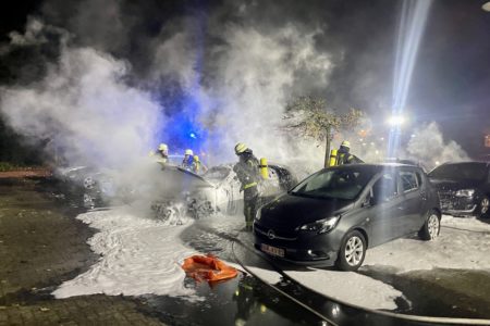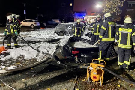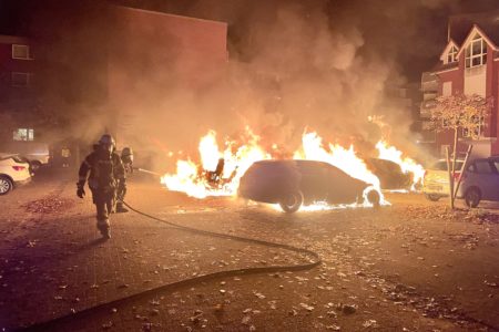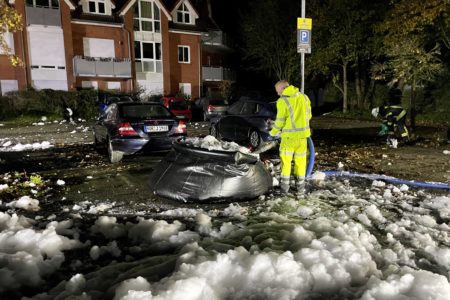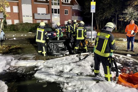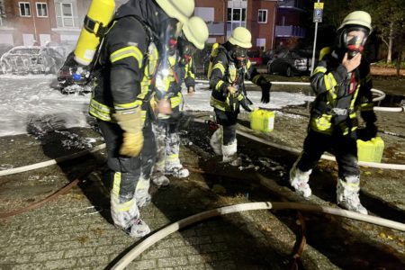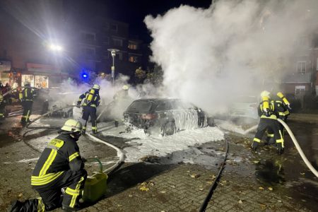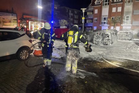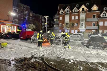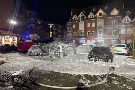 Ein brennender Pkw ist in der Nacht zu Donnerstag gegen 3.25 Uhr per Notruf in Norden gemeldet worden. Der Wagen stand auf einem Supermarktparkplatz in der Pottbackerslohne. Als die Polizei und die Freiwillige Feuerwehr Norden wenige Minuten später den Einsatzort erreichten, brannten bereits drei Fahrzeuge. Noch bevor die Feuerwehr einen Löschangriff aufbauen konnte, brannte der Kraftstofftank eines der Fahrzeuge durch. Der austretende Kraftstoff entzündete sich sofort und setzte einen vierten Pkw in Brand.