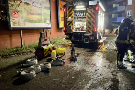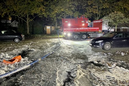 Mit der Brandbekämpfung war der Einsatz für die Feuerwehr jedoch nicht beendet. Durch den massiven Löschangriff fielen auch größere Mengen kontaminiertes Löschwasser an, welche eine Gefahr für die Umwelt darstellten. Mit Dichtkissen verschlossen die Feuerwehrleute daher die Gullys auf dem Parkplatz. Unter Aufsicht der Unteren Wasserbehörde des Landkreises Aurich pumpten die Feuerwehrleute das Gemisch aus Wasser, Schaum, Betriebsstoffen und Brandrückständen in einen Auffangbehälter. Eine beauftragte Fachfirma übernahm am frühen Morgen die weitere Reinigung der Parkflächen und übernahm das bereits abgepumpte Gemisch mit einem Saugwagen.